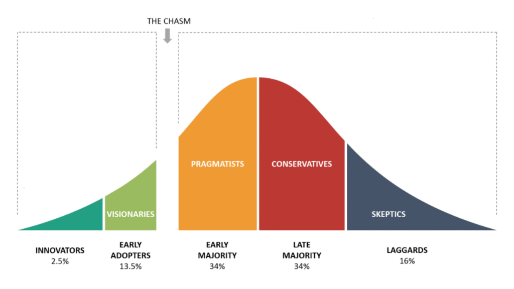 • Late majority adopts out of necessity. Offer reassurance, peer support, and steady reinforcement.