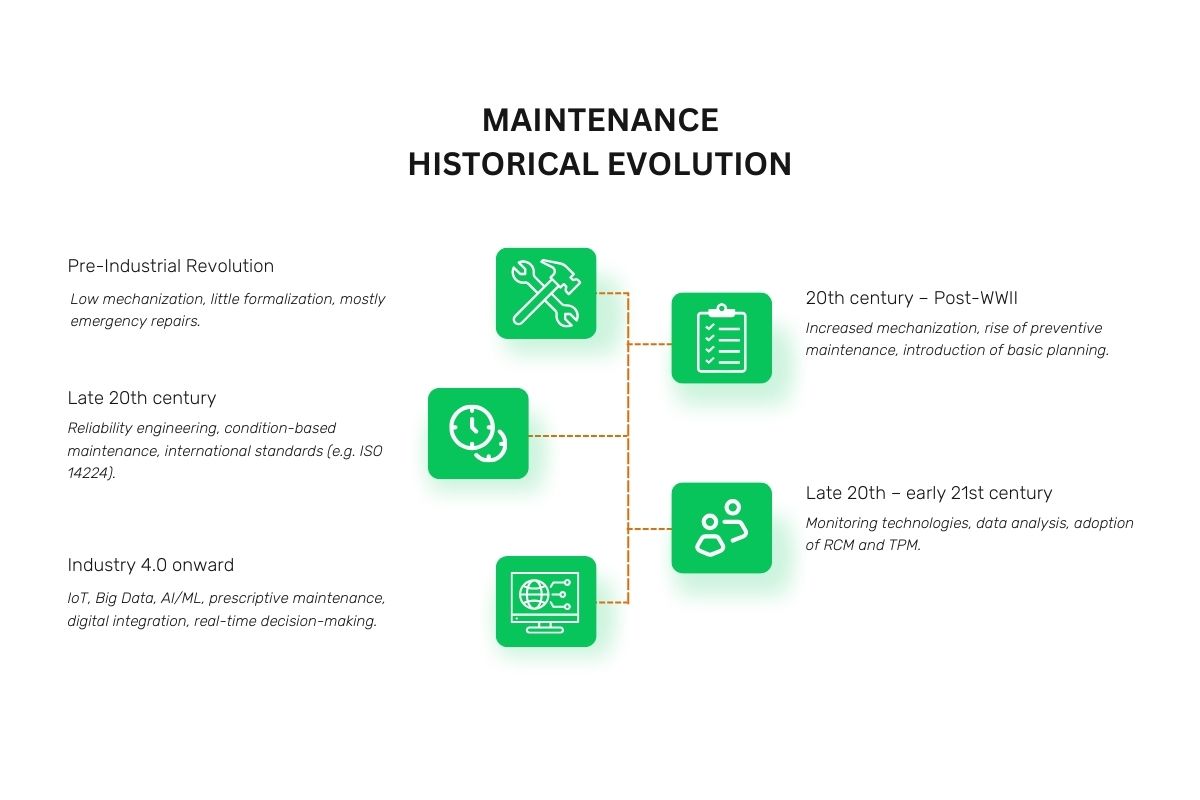 Before the Industrial Revolution, maintenance was mostly artisanal, with little mechanization and no formal processes. Interventions happened almost exclusively as emergencies — only when something had already gone wrong.